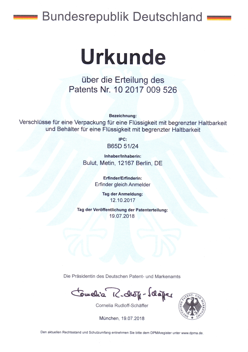 Patenturkunde Patenturkunde Wichtiger Hinweis Die Einspruchsfrist nach § 59 PatG – „Einspruch gegen erteiltes Patent“ ist am 19.04.2019 abgelaufen. Gegen das Patent wurde kein Einspruch erhoben. Die Mitteilung des DPMA liegt schriftlich vor.